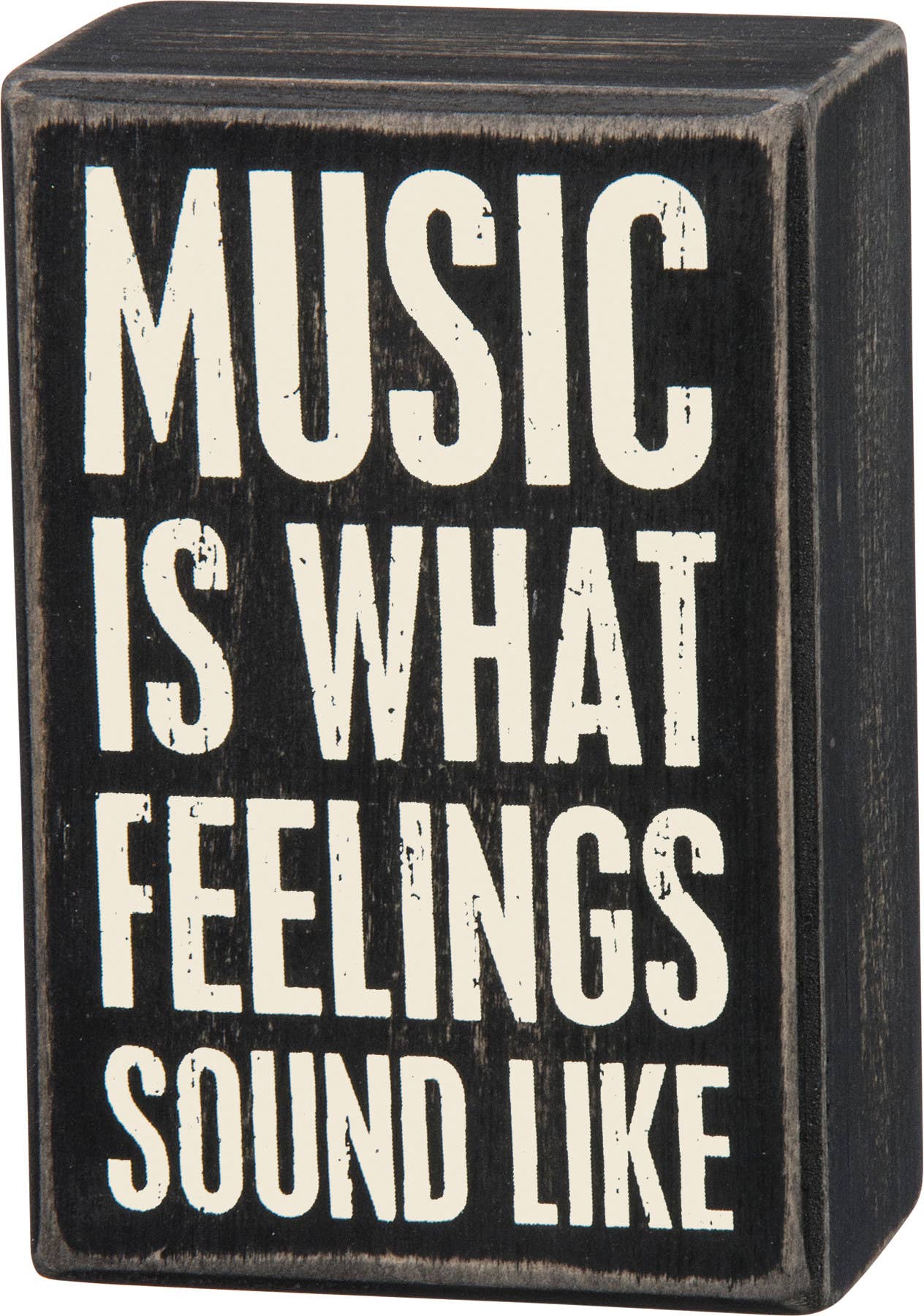 A classic black and white wooden box sign featuring a distressed "Music Is What Feelings Sound Like" sentiment. Easy to hang or can free-stand alone. Not eligible for discounting.